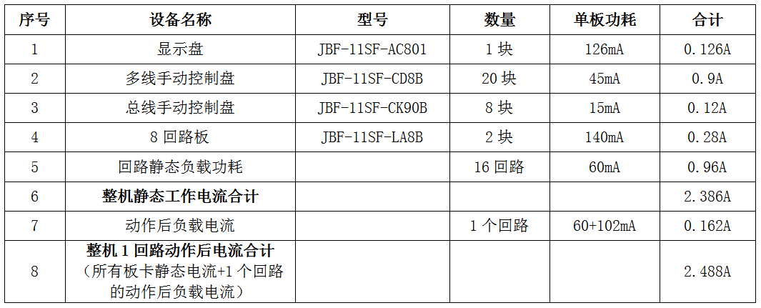 通过以上计算得知,JBF-11SF控制器(16回路)整机在静态待机工作时的电流值为2.386A,在某1回路设备动作后(国标要求不少于50只),整机工作电流2.488A,控制器标配系统电源最大输出电流10A,完全满足本机工作需求。