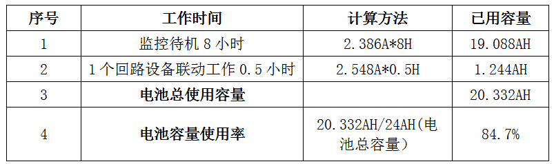 通过以上计算得知,控制器备用电池在待机8小时后某1回路设备动作后(国标要求不少于50只)持续工作0.5小时,电池容量的总使用率为84.7%。因此控制器标配24AH备用电池容量完全满足国标要求。